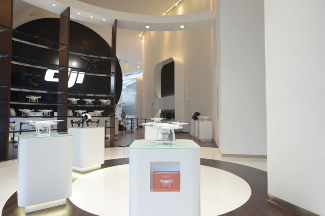 Площадь магазина, который называют «флагманским» (flagship store) составляет 800 квадратных метров, он расположен в Шэньчжене, городе в провинции Гуандун на юге Китайской Народной Республики. Там же находится и штаб-квартира компании. В магазине потенциальные покупатели могут не только посмотреть на дроны и потрогать их, но и самостоятельно попробовать их в полете.