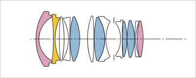 Объектив сотоит из 13 элементов в 11 группах, включая 2 асферических стекла (минимизированы искажения типа "бочка") и SLD/FLD-элементов для снижения хроматических аберраций. Диафрагма девятилепестковая. Минимальное значение диафрагмы — F16. Дистанция фокусировки от 30 см.